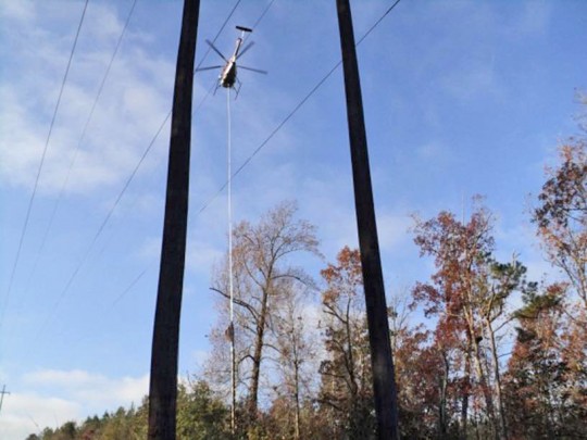 They are using a Hughes 369D helicopter with a suspended aerial power saw to accomplish this task. The saw has ten, 24-inch blades that swing back and forth trimming trees and other foliage in close proximity of the high voltage lines. Periodic right-of-way service is necessary to keep power lines clear of tree brush so they will not cause harm to people or a disruption in electrical service.