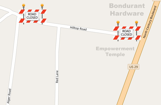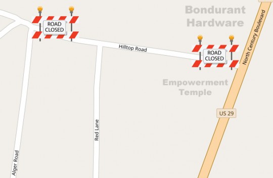 Hilltop Road in Century will be closed from North Century Boulevard (Highway 29) to Alger Road beginning at 9 a.m. Friday for maintenance, according the Town of Century. A reopening timetable was not provided. NorthEscambia.com graphic.