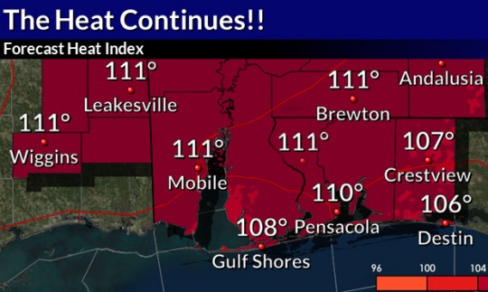 Wednesday: Mostly cloudy. Chance of showers and thunderstorms in the morning, then showers and thunderstorms likely in the afternoon. Highs in the mid 90s. Southwest winds up to 5 mph shifting to the south in the afternoon. Chance of precipitation 70 percent. Heat index readings around 112.