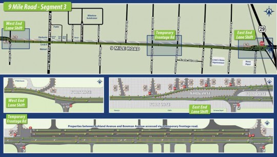 - Bowman Avenue to Ashland Avenue.: Due to an elevation change, access to the properties on the north side of Nine Mile Road between Bowman and Ashland avenues will be acquired via a frontage road instead of directly from Nine Mile Road.