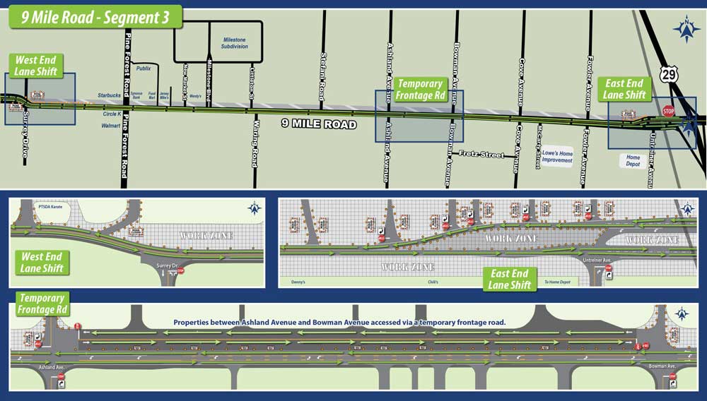 - New stop sign at Highway 29 off-ramp: Vehicles turning right onto westbound Nine Mile Road from southbound U.S. 29 will be required to come to a full stop before merging with westbound traffic.