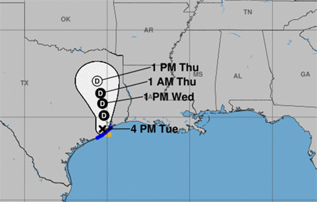 Imelda formed in the Gulf just before making landfall about 1 p.m. near Freeport, Texas, with winds of 40 mph. It’s continuing to move inland and will quickly weaken below tropical storm status.