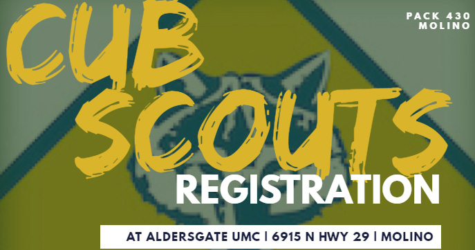 Molino Cub Scout Pack 430 will hold registration on Tuesday from 6:30 until 7:30 p.m. at Aldersgate United Methodist Church at 6915 Highway 29.