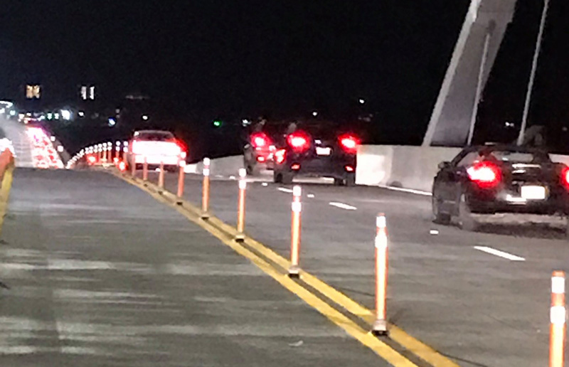 The temporary configuration for the new bridge will provide two lanes of east and two lanes of westbound traffic, along with a center-lane reserved for emergency vehicles. A multiuse path for pedestrians and bicyclists is expected to be operational near the end of 2019.
