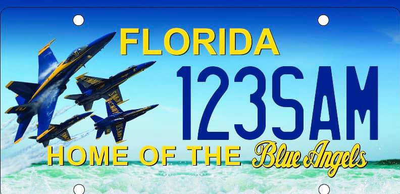 The plate design includes the words “Home of the Blue Angels” at the bottom.
