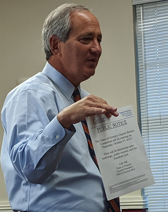 Members of the Town of Century Charter Review Committee learned about the Sunshine Law and public records requirements in the meeting with town attorney Matt Dannheisser. Two town council members, Sandra McMurray-Jackson and Luis Gomez, also attended the meeting.