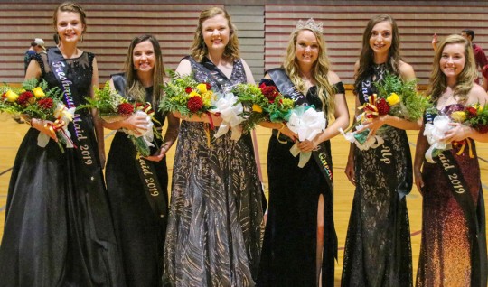 Pictured below are Freshman Maid McKenna Simmons, Sophomore Maid Payton Gilchrist, First Runner-up Raleigh Woodfin, Queen Cloe Smith, Second Runner-up Karlee Criswell, and Junior Maid Franki Daw.