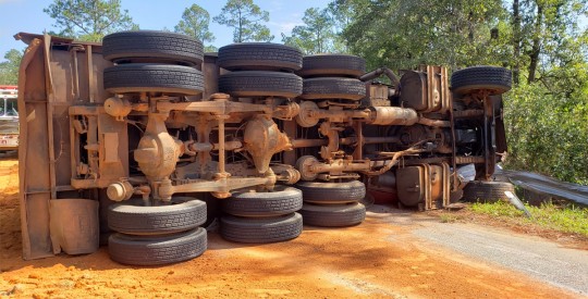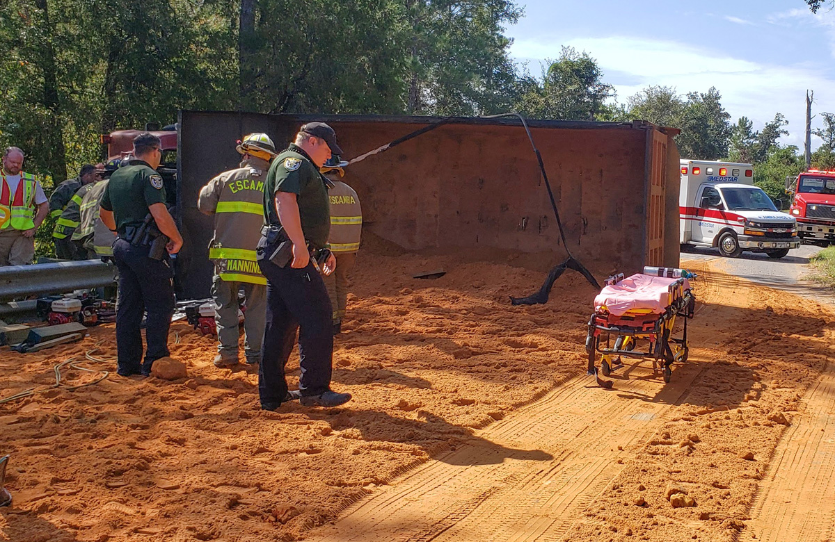 The driver lost control of his loaded dump truck at the Barrineau Park Bridge that spans the Perdido River between Alabama and Florida. The truck overturned on the Alabama (western) end of the bridge. The driver was pinned by the wreckage and a guardrail.