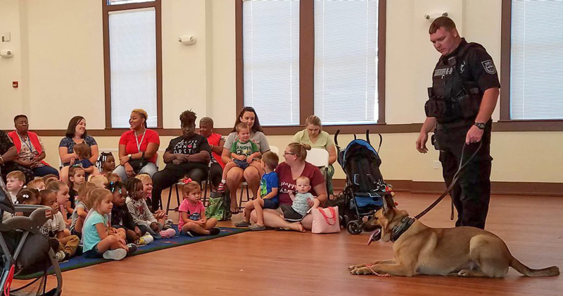 An Escambia County Sheriff’s Office deputy and his K-9 attended the Community Heroes Preschool Story Time Series Wednesday at the Molino Branch Library.