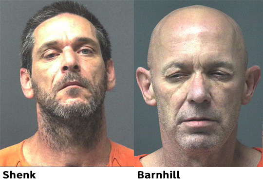 Christian James Shenk, 48, was charged with possession of a controlled substance (meth) and possession of drug paraphernalia. Michael Wayne Barnhill, 55, was charged with possession of a controlled substance (meth), possession of drug paraphernalia and second degree possession of marijuana.