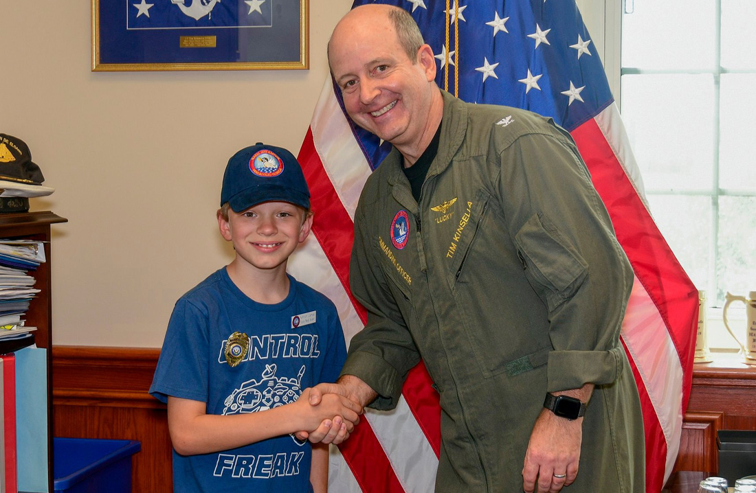 His dream is to join the military and be a pilot. Capt. Tim Kinsella Jr., commanding officer, gave Kohlton a NAS Pensacola hat with his new call sign, “Iron Man,” and a set of aviation wings.