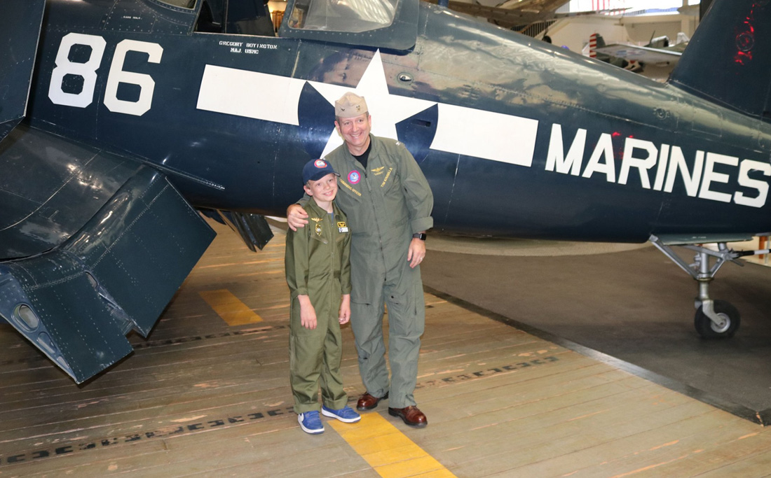 He was also given a signed photograph from the Blue Angels and was driven to the National Naval Aviation Museum in a police car. At the museum, he had a party with his friends and got to pose for a photograph in front of the F4U Corsair aircraft his great grandfather actually flew in World War II.