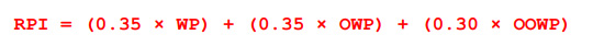 The RPI is based upon a mathematical formula that takes into the number of games won (WP), the winning percentage of the opponent (OWP), and the winning percentage of the opponent’s opponents (OOWP). The math looks like this: