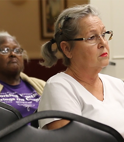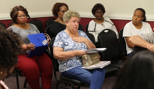 Pictured top: Century Charter Review Committee member Evelyn Hammond, a former mayor, addresses the group Monday evening. Pictured inset above: Mary Bourgeois. Pictured below: Most of the meeting was conducted by Interim City Manager Buz Eddy. NorthEscambia.com photos, click to enlarge.
