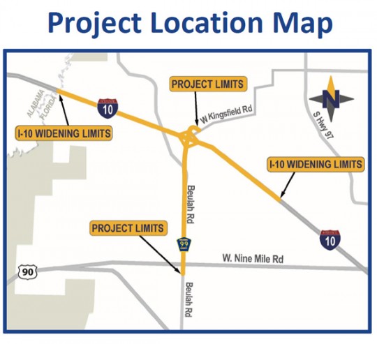 The project includes the widening of Beulah Road from West Nine Mile Road to Isaacs Lane, the realignment from Isaacs Lane to West Kingsfield Road, a new interchange at I-10 and the widening of I-10 from the Florida/Alabama line to the Pensacola Weigh Station.