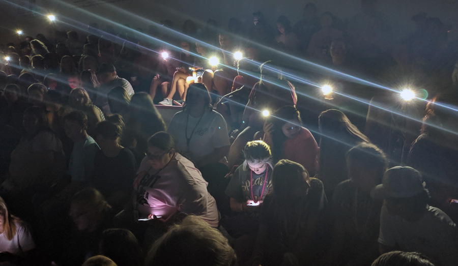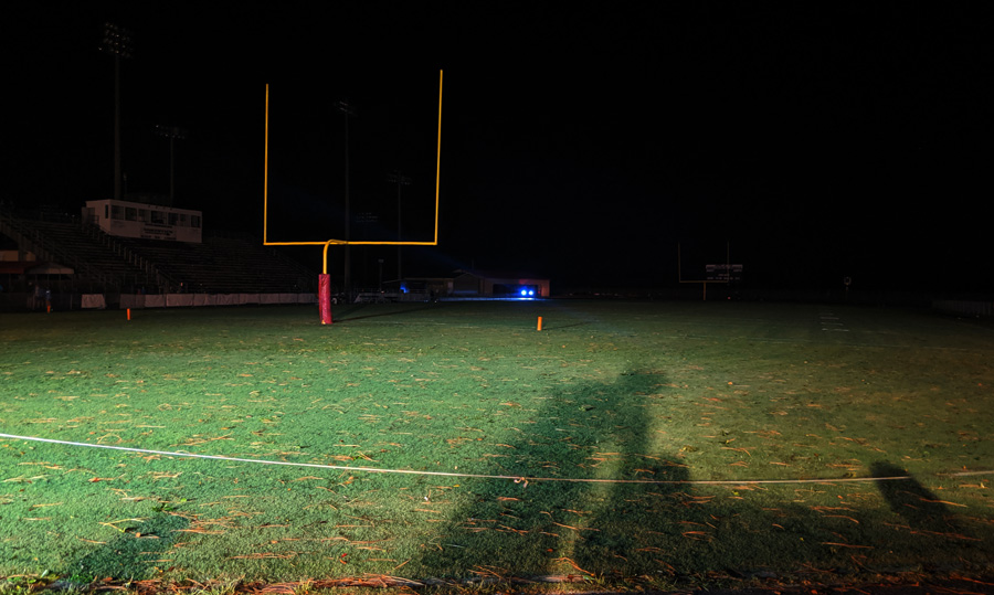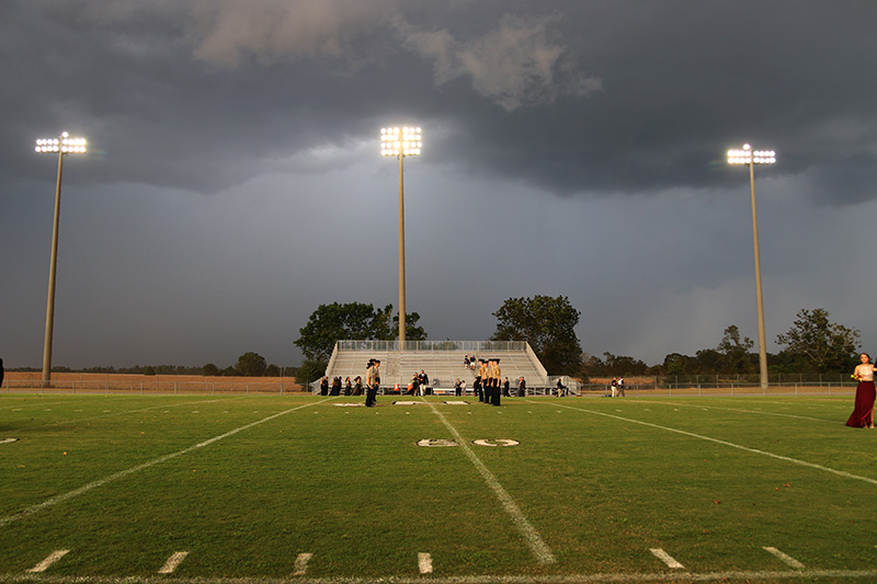 Schools officials abruptly ended outdoor homecoming court activities just after 6 p.m. as lightning popped nearby, moving everyone into the school gym to try again. A short time later, the power went out, leaving homecoming activities and a crowded gym in the dark for about an hour. Fans and players were rushed out of the stadium again at halftime due to lightning. The power was cut off during halftime for emergency repairs on nearby Pine Barren Road, leaving the stadium in the dark and significantly delaying the game.