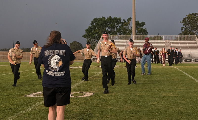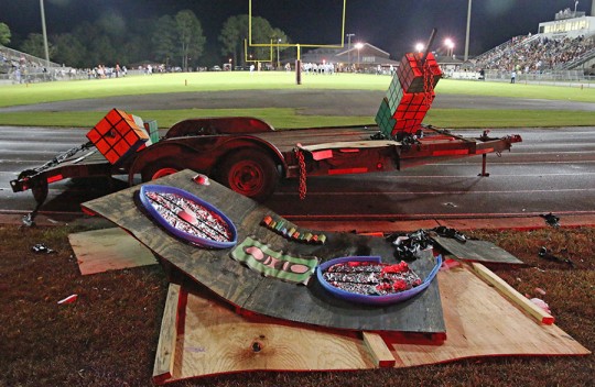 Pictured above: The Northview stadium in the dark at halftime Friday night, except for emergency lighting provided by fire trucks and an ambulance. Pictured below: Homecoming activities moved into the school gym due to lightning, but the power went out for about an hour. Pictured next below: Storm clouds approach the stadium during the start of homecoming activities, with lightning forcing the NJROTC and homecoming court to run for cover. Pictured bottom: Homecoming floats in the stadium were flattened by high winds. NorthEscambia.com photos, click to enlarge.