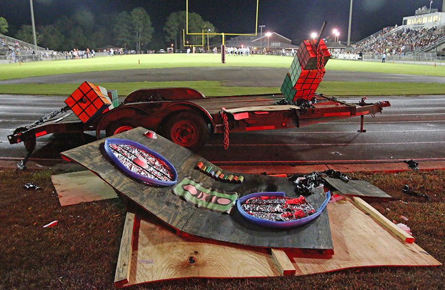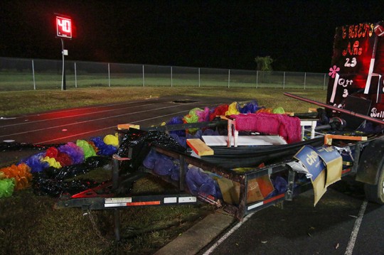 Homecoming floats parked in the stadium were flattened by high winds during the storm.