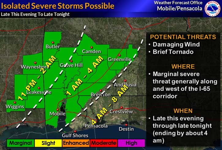 An approaching storm system will bring a line of showers and storms through the area late tonight into early Sunday morning. Damaging winds will be the primary concern, but a brief tornado cannot be ruled out.
