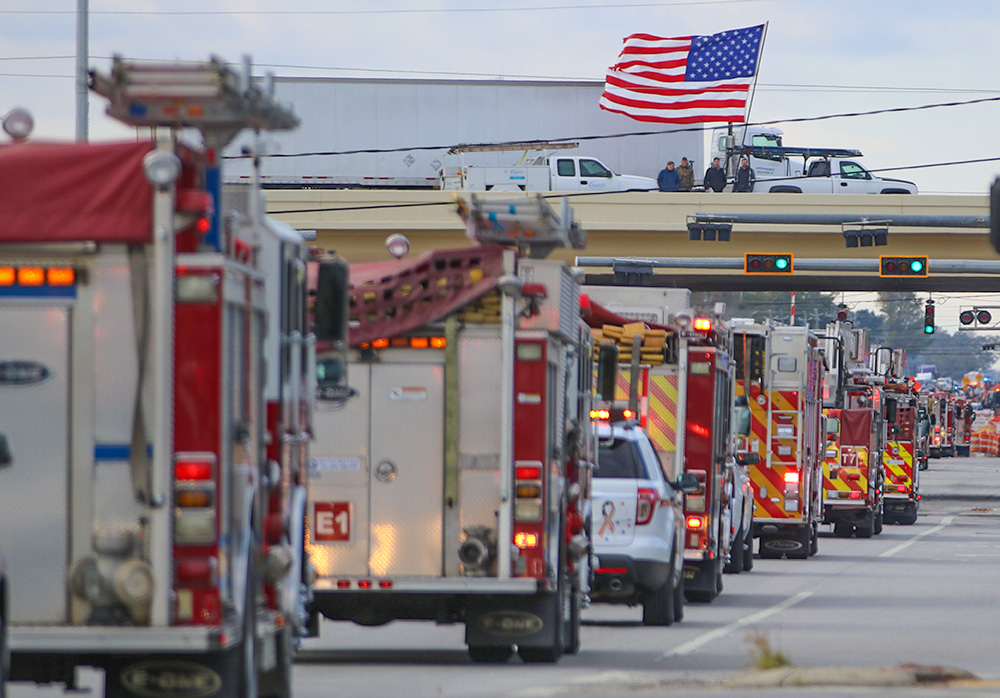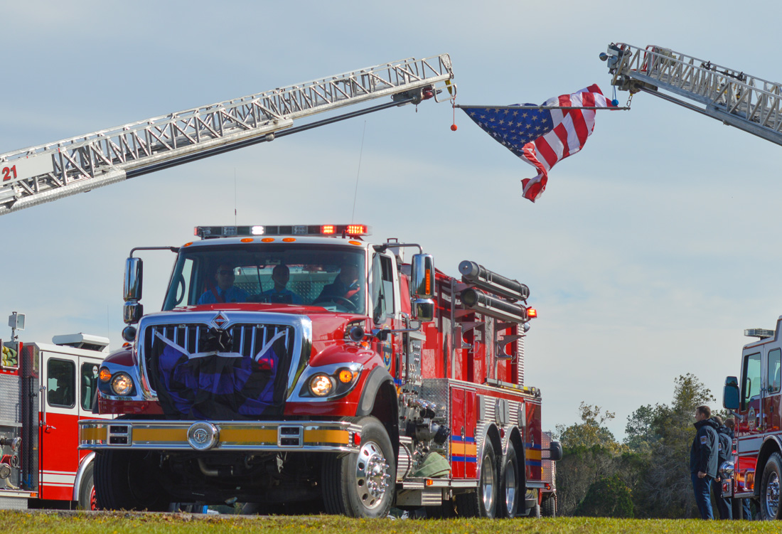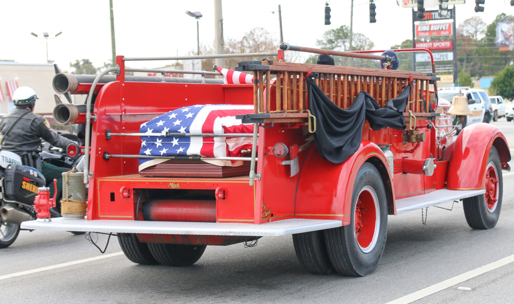 A lengthy funeral procession with dozens of emergency vehicles from departments across the Gulf Coast traveled from Hillcrest Baptist along Nine Mile and Pine Forest roads to his final resting place at Pensacola Memorial Gardens. Bradshaw’s flag-draped coffin was carried open-air in the back of an antique fire engine. Along the way, people line the roadway, many holding flags blowing in a frigid north wind. Some stood with their hands over their hearts.