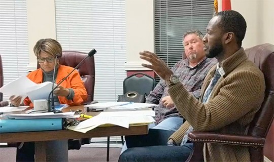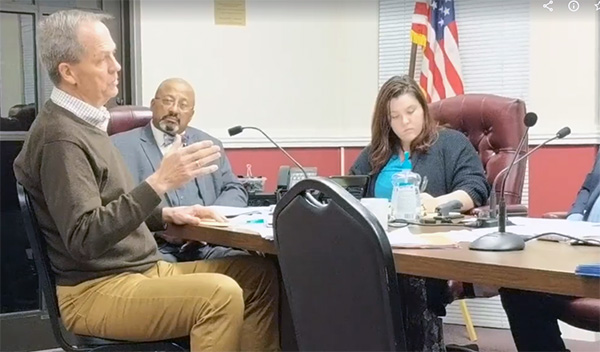 Pictured top: Council member James Smith (far right) expresses opposition to hiring Vernon Prather as interim city manager. Pictured inset: Prather. Pictured below: Current interim city manager Buz Eddy speaks in favor of Prather replacing him. NorthEscambia.com photos, click to enlarge.