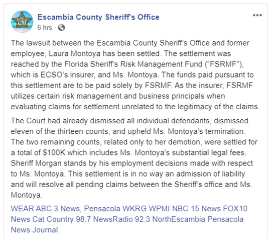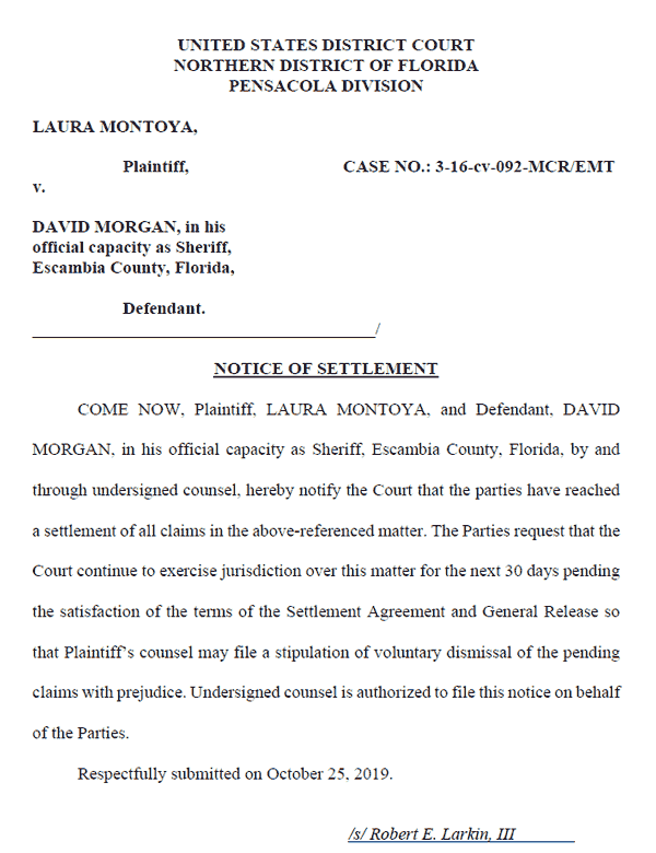 A discrimination lawsuit again Escambia County Sheriff David Morgan has been settled out of court.