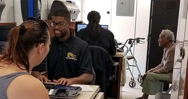 FLOW is a stand-alone mobile office with technology to provide most motorists’ needs. The mobile unit provides a convenient method to renew a driver’s license, obtain a replacement driver’s license, conversion or reciprocation of out-of-state license, change a name or address on a current driver’s license or identification card, and get a first-time identification card. In addition to licensing services, the mobile unit also provides an opportunity to renew or replace a vehicle registration and apply, renew or replace disabled parking placards. Written and driving tests are not available from the FLOW unit.