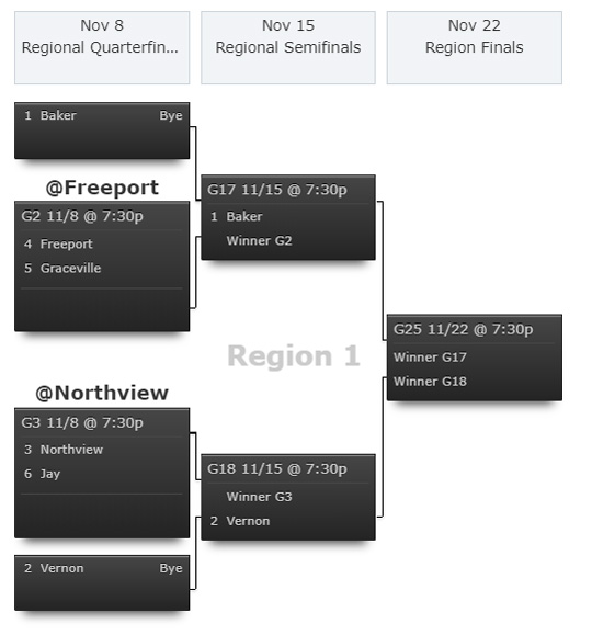The Baker Gators remain the top ranked team in Region 1-1A and have a bye Friday night, along with Vernon, the No. 2 ranked team. The Chiefs are ranked No. 3, while Jay is ranked No. 6. Only the top six teams in the region make the playoffs.