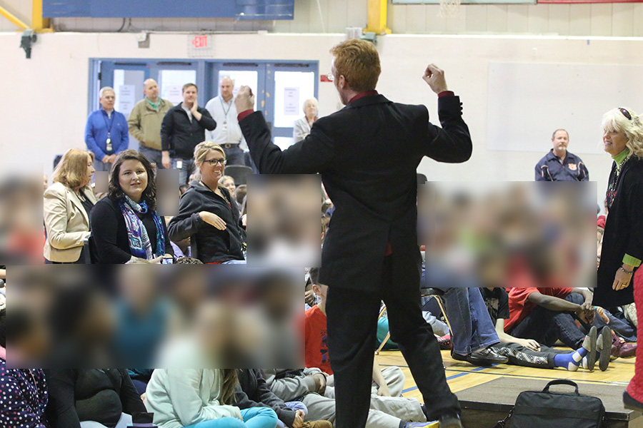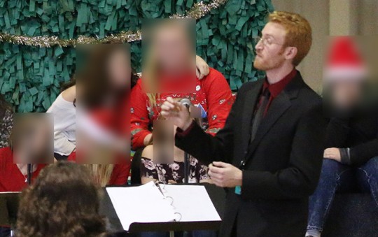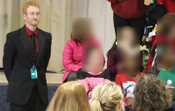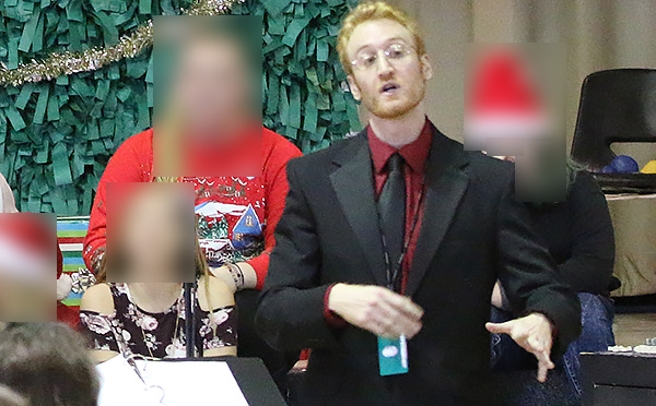 Pictured above and below: James McAllister leads the Ernest Ward Middle School band and chorus during a Christmas program December 16, 2016. Pictured bottom: McAllister leads the entire Ernest Ward Middle School student body in Christmas carols on December 16, 2016. NorthEscambia.com chose to blur student faces from our original photos because the students are unrelated to “Operation Rotten Pumpkin”. NorthEscambia.com photos, click to enlarge.