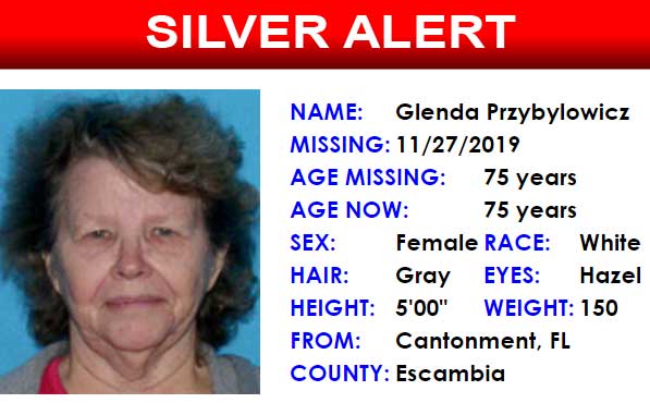 A Florida Silver Alert has been issued for 75-year old Glenda Przybylowicz of Cantonment. She was last seen in the area of the 2800 block of Old Chemstrand Road in Cantonment.