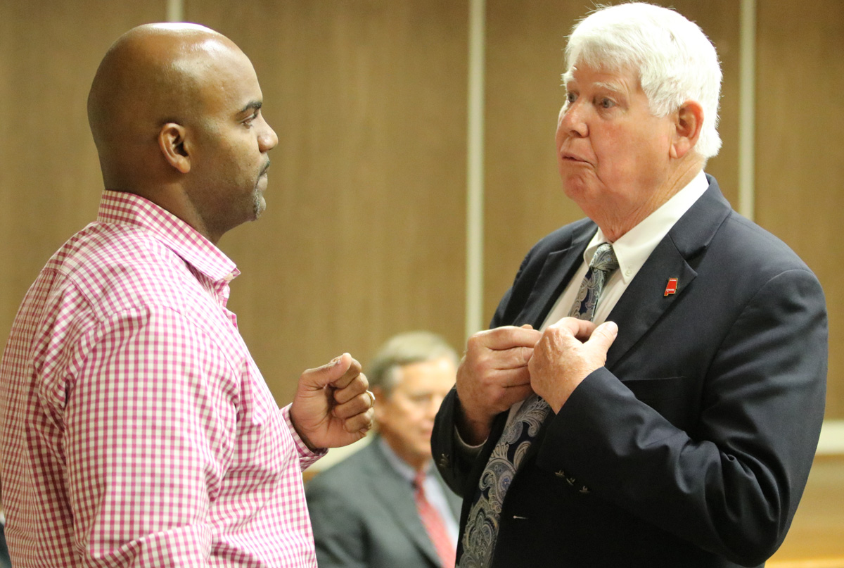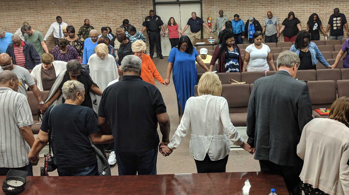 Pictured above and inset: Atmore Citizens for Change President Loumeek White (left) and Atmore Mayor Jim Staff discuss a city school system during an Atmore City Council meeting in March 2019. Pictured bottom: City officials, council members and audience members held hands and prayed after the March meeting. NorthEscambia.com photos, click to enlarge.
