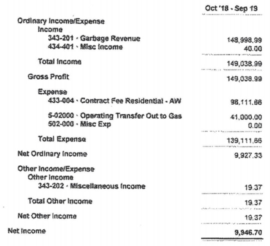 In an article published Tuesday, NorthEscambia.com reported the town’s garbage department showed a profit of $50,927.33. Of that, $41,000 was transferred to the troubled gas fund, leaving a positive balance of $9,927.33 in the gas fund at the end of the fiscal year. The numbers are clearly indicated on the town’s year end financial statement (pictured below).