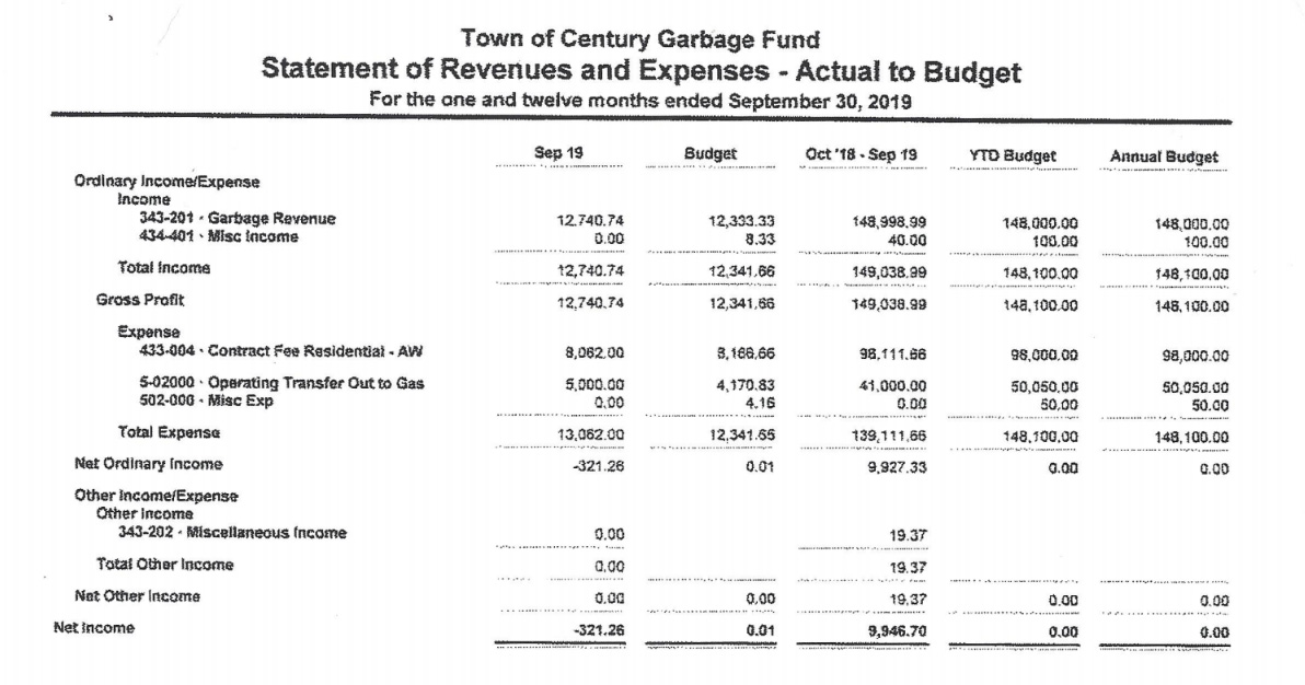 Pictured top: A special Century council meeting Wednesday. Pictured below: A condensed version of the year end financial statement for the Town of Century’s garbage fund. Click the image to see the full version. NorthEscambia.com photo/image, click to enlarge.