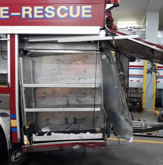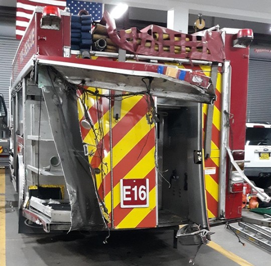 Escambia Fire Engine 16 had responded to a medical call on Barrancas Avenue when the truck was hit by a pickup truck driver. The pickup continue some 100 feet or more, traveled through a fence and crashed into an apartment complex.