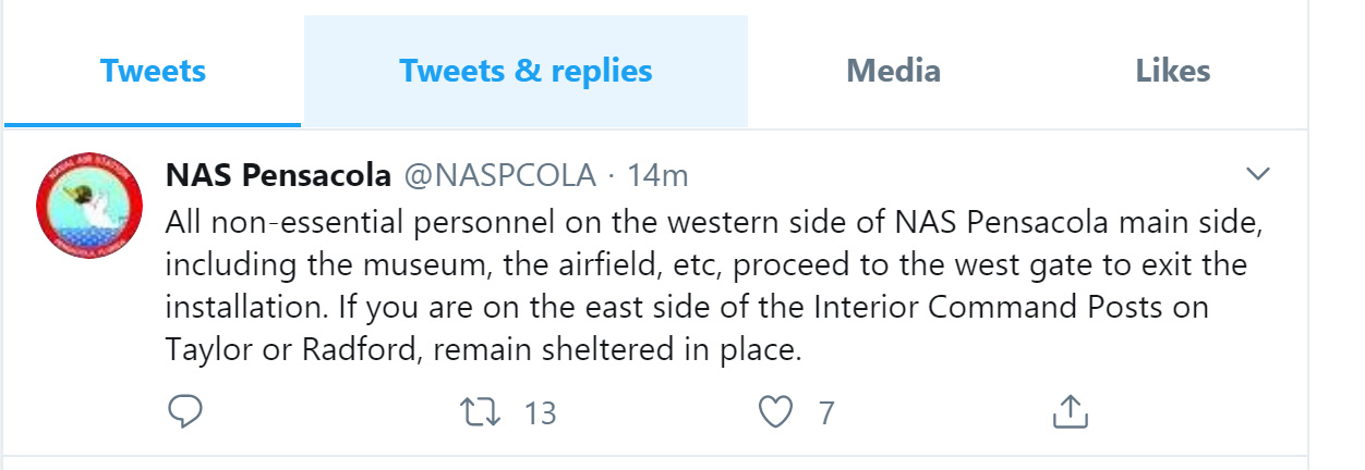 The base released the following statement: “All non-essential personnel on the western side of NAS Pensacola main side, including the museum, the airfield, etc, proceed to the west gate to exit the installation. If you are on the east side of the Interior Command Posts on Taylor or Radford, remain sheltered in place.”