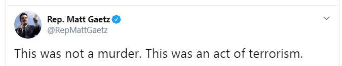 “This was not a murder. This was an act of terrorism,” Congressman Matt Gaetz said. “This will be treated as an act of terrorism, not a murder.”