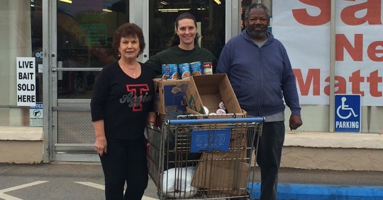 The Tate High Alumni Association is known for giving back to the community. They recently collected food items and presented them to the mission program at the Cross Roads Thrift Store in Molino. The food was delivered Wednesday by Grace Howard Paulcheck (left) to Ashley Seward and Darnell Crenshaw. Photo for NorthEscambia.com, click to enlarge.