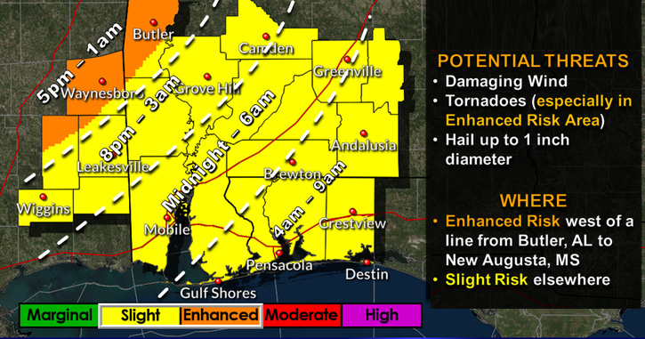 There is a marginal risk of severe storms Monday night into Tuesday morning in the North Escambia area.