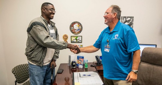 Pictured: Escambia County Veterans Service Officer Andy Huffman (right) meets with veteran James Borham. Photo for NorthEscambia.com, click to enlarge.