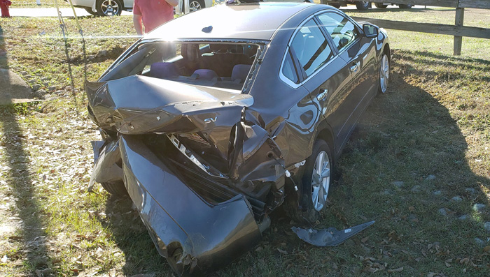 One least one person was injured in a two vehicle crash Saturday afternoon on Highway 297A at Carmody Hill Road in Cantonment.