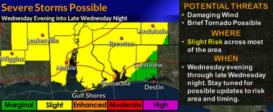 There is slight risk of severe storms Wednesday evening into late Wednesday night. The biggest threat will be damaging winds and a possibly a brief tornado.