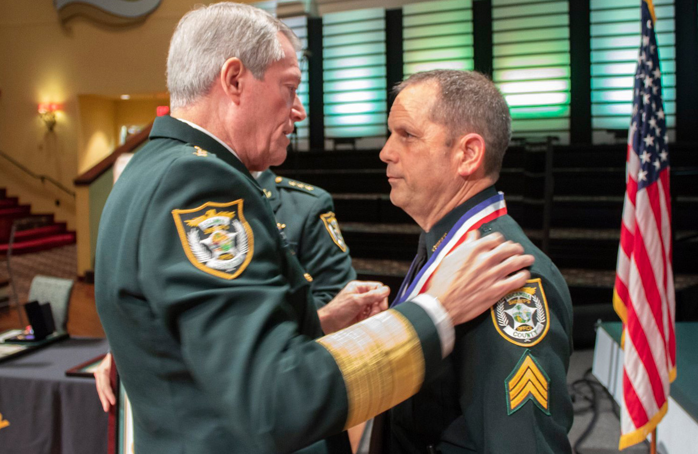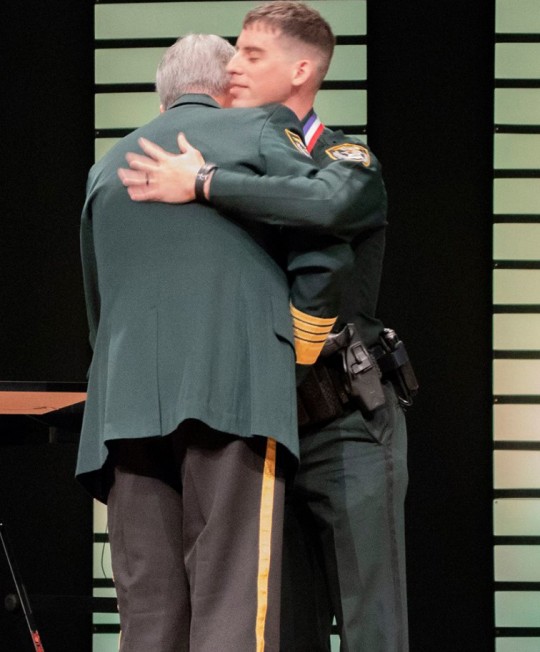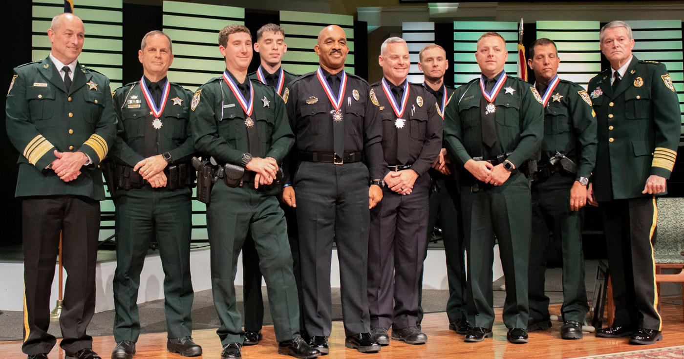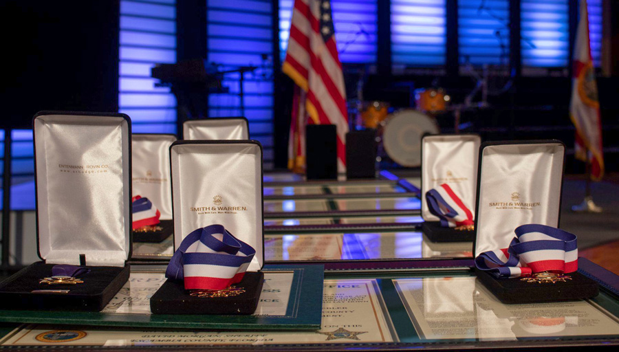 Honored were Escambia County Sheriff’s Office Sgt. Mike Hoyland, Deputy Matthew Keebler, Deputy Matthew Housam, Senior Deputy Grant Lopez, Deputy Jonathan Glass, and Deputy Matthew Tinch; and Department of Defense security officers Captain Robert Johnson and Captain Charles Hogue. They were awarded the Medal of Valor for going above and beyond during the attack that left three people dead.
