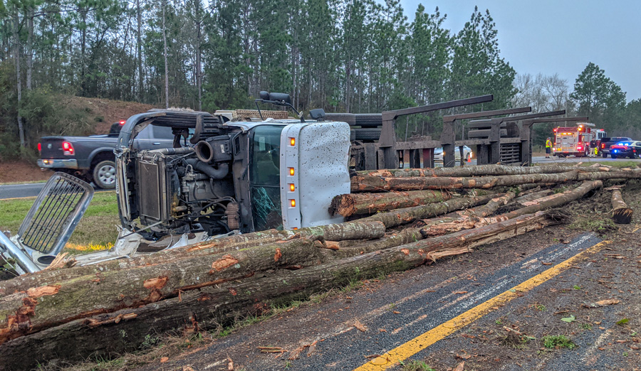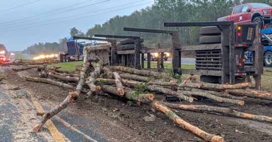 Southbound traffic was diverted into the northbound lanes as northbound was reduced to one lane. Traffic was stopped in both directions at times during the cleanup. In addition to righting the log truck and removing the logs, a second semi-truck had to be pulled from the median after it became stuck when the driver attempted to crossover and go around the initial crash.