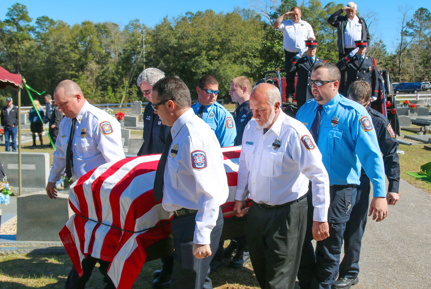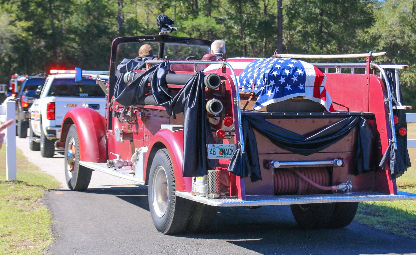 Rigby’s flag-draped reclaimed barnwood casket was carried to the cemetery on the back of a 1946 Mack fire truck, passing under a large American flag flying high above North Highway 99 from an Escambia Fire Rescue ladder truck.