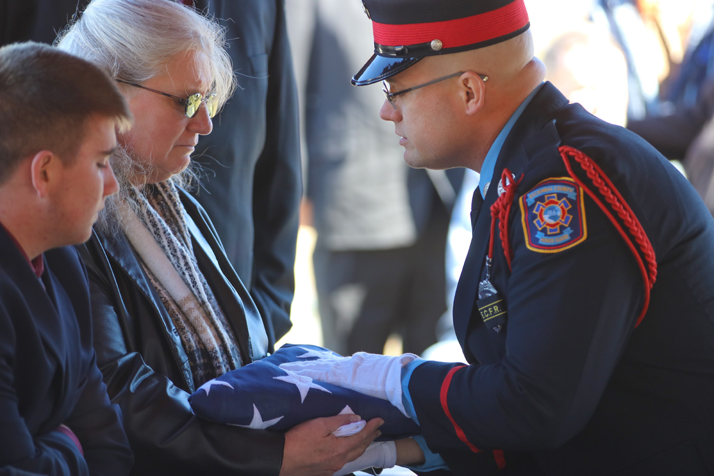 An Escambia Fire Rescue honor guard presented his widow Sherri Rigby with the American flag.. His daughter, Kristi Rigby Hughes, was given his helmet, and son Chad Rigby received his badge.