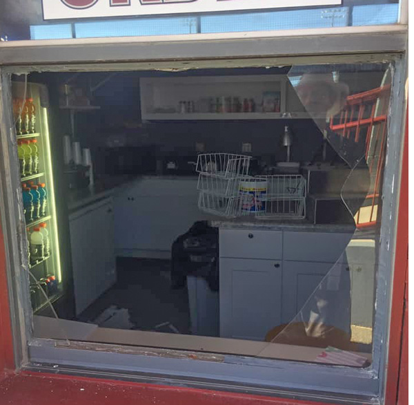 A large brick was thrown through a window, and about $300 worth of food and drink were stolen, according to the baseball booster club.