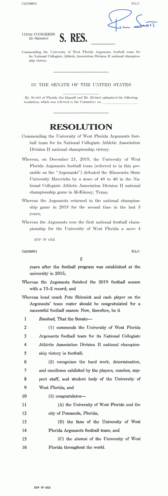 Senators Rick Scott and Marco Rubio submitted the resolution “”Commending the University of West Florida Argonauts football team for its National Collegiate Athletic Association Division II national championship victory”. It passed the senate unanimously.