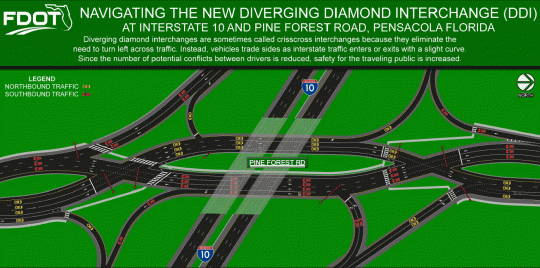 A FDOT animation of a diverging diamond intersection at I-10 and Nine Mile Road is below.