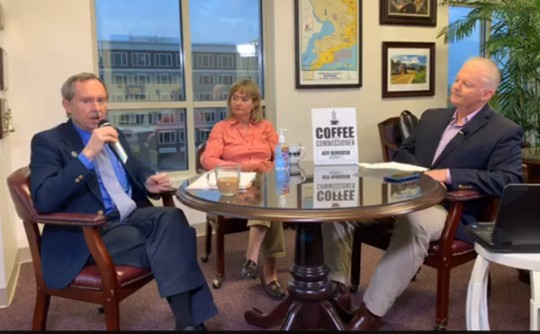 Pictured: (L-R) Dr. John Lanza, Janice Gilley and Jeff Bergosh during an early morning “Coffee with the Commissioner” livestream. Image for NorthEscambia.com, click to enlarge.