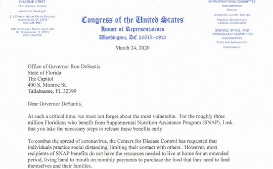 “The COVID-19 global pandemic has left many Floridians without a steady stream of income placing great stress on those in need. In response to these growing demands, and the potential requirement for some SNAP recipients to need to self-quarantine for 14 days or more, I urge you to offer the early release of next month’s SNAP benefits, effective immediately,” Crist wrote.